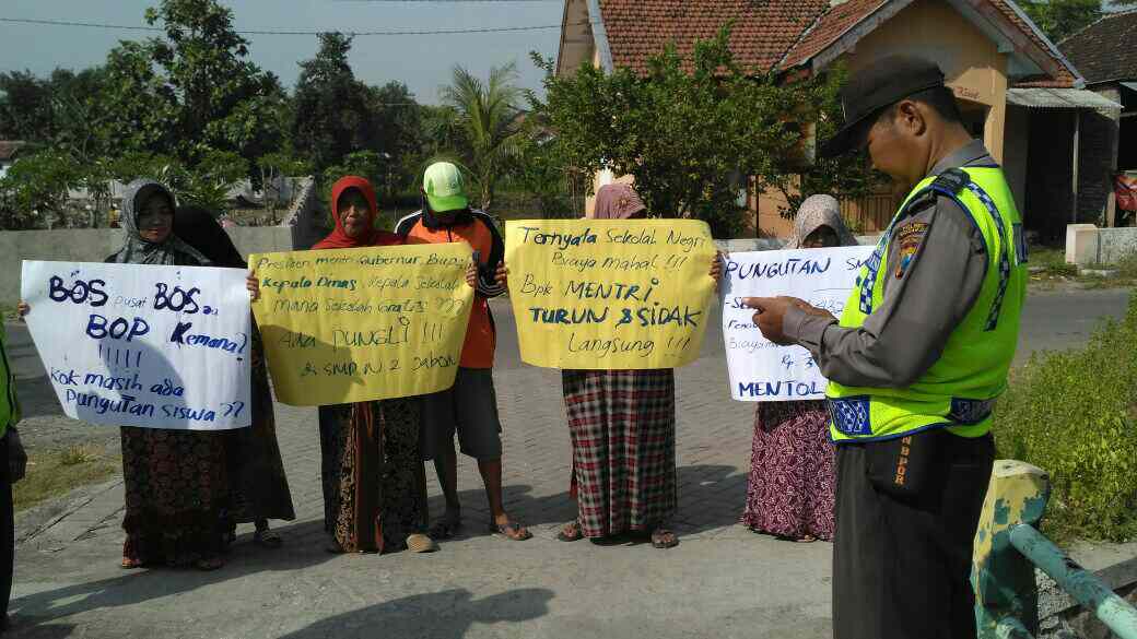 INDONESIA VISIONER – SIDOARJO, JABON – Sejumlah wali murid SMPN 2 Kecamatan Jabon menggelar unjuk rasa, kemarin (22/8). Bertempat di depan sekolahan yang terletak di Desa Permisan itu, mereka memprotes kebijakan dana partisipasi yang ditentukan sekolah. Dana partisipasi senilai Rp 3.340.000 itu yang dibebankan pada siswa baru tersebut dianggap memberatkan.