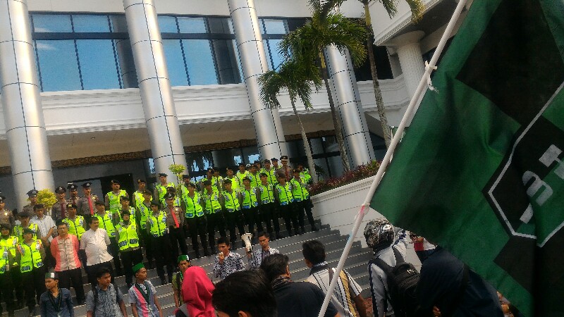 Ratusan massa HMI dan Pemuda Sumbar dalan aksinya melakukan jalan kaki dari Sekretariat HMI Sumbar di Jalan Hang Tuah, Kecamatan Padang Barat menuju Mapolda Sumatera Barat dan melakukan orasi di bawah guyuran hujan.