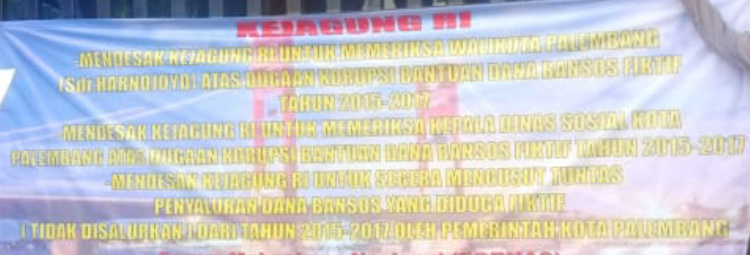 “Dana bansos APBD tahun anggaran 2015 untuk dibagikan kepada masyarakat miskin dikota Palembang tidak dibagikan kepada nama-nama penerima, alamat dan besaran yg terdaftar sebagai masyarkat penerima yang di sahkan oleh peraturan walikota nomor 9 tahun 2015 tentang penjabaran APBD T.A 2015.