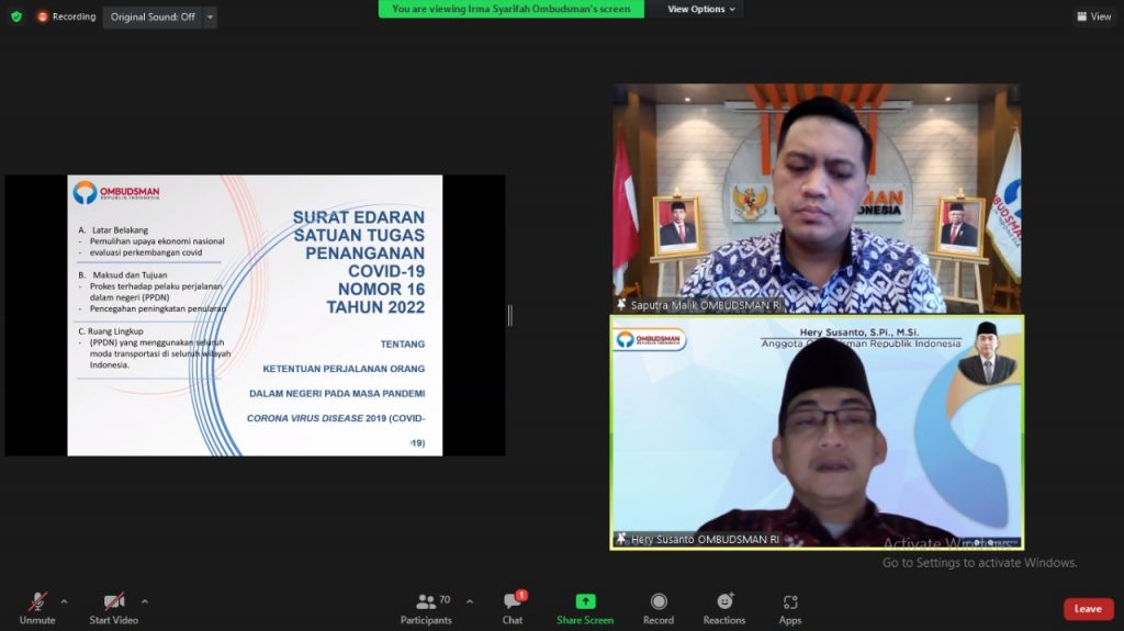 Pemantauan pelayanan publik pada sektor perhubungan dalam rangka penegakan protokol Covid-19 di masa pendemi disampaikan saat ORI menggelar pertemuan daring bersama jajaran Kementerian Perhubungan dan Kementerian Kesehatan terkait persiapan pemantauan pelayanan publik arus mudik.