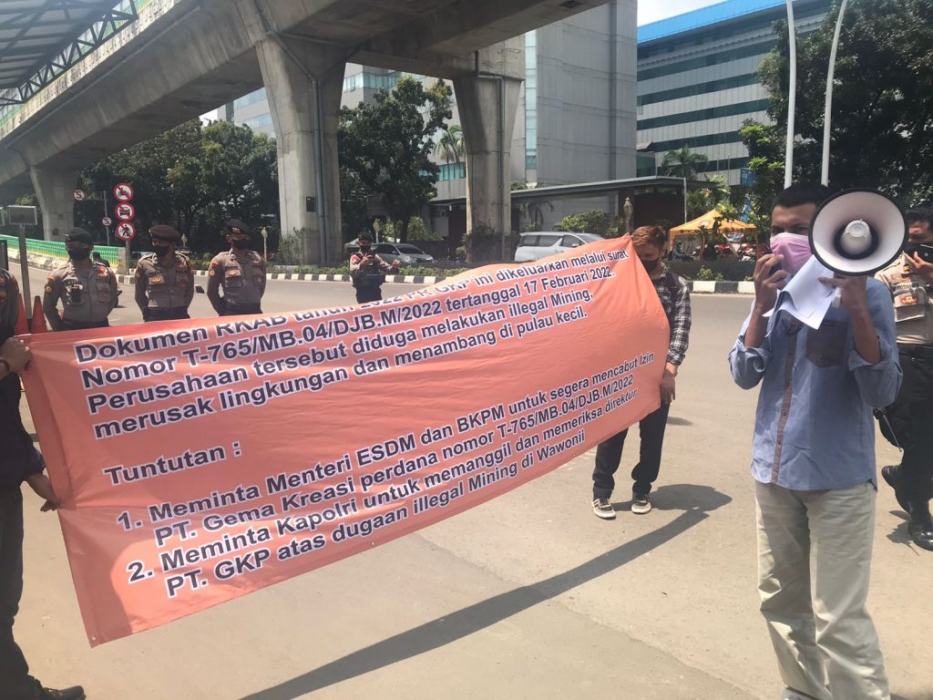 Jakarta,- Puluhan Mahasiswa yang tergabung dalam Indonesian Mining and Environment Observer Youth (IMEOY) melakukan unjuk rasa di Mabes Polri, Selasa, 6/9/2022. Kedatangan mereka minta Kapolri untuk segera memanggil dan memeriksa Direktur Utama PT Gema Kreasi Perdana (GKP) karena diduga melakukan illegal Mining dan melakukan penambangan di pulau kecil.