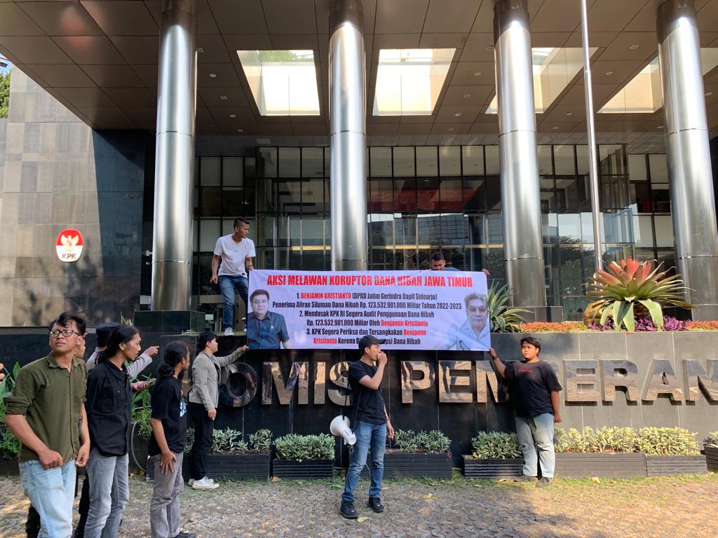 Mereka meminta KPK memeriksa Anggota Dewan Perwakilan Rakyat Daerah (DPRD) Jawa Timur Fraksi Partai Gerindra Benjamin Kristianto terkait dugaan menerima aliran siluman dana hibah Jatim.