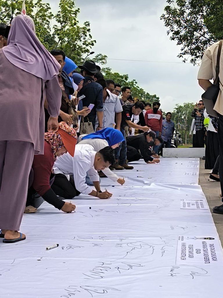 Kegiatan tersebut ditutup dengan penandatangan spanduk putih oleh ribuan masyarakat. termasuk ASN, Satpol PP, tokoh masyarakat, tokoh adat, dan seluruh peserta aksi damai sebagai bukti dukungannya untuk PJ Bupati Banyuasin.