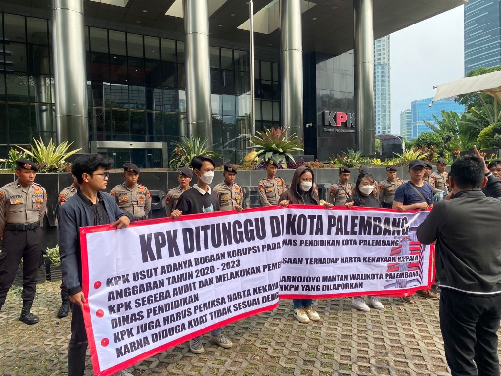Tuntutan itu disampaikan oleh sejumlah pemuda yang mengatasnamakan Gerakan Aktivis Mahasiswa Sumsel (Gamas) saat melakukan aksi depan Gedung Merah Putih KPK RI, Kuningan, Jakarta Selatan pada Rabu (27/12/2023).