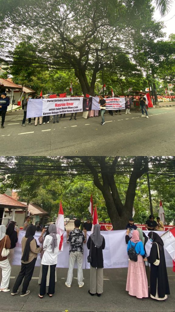 Menurut koordinator aksi, Marcel Kusnanda, salah satu calon Bupati Muara Enim yang digadang-gadang akan diusung oleh partai Gerindra adalah Nasrun Umar.