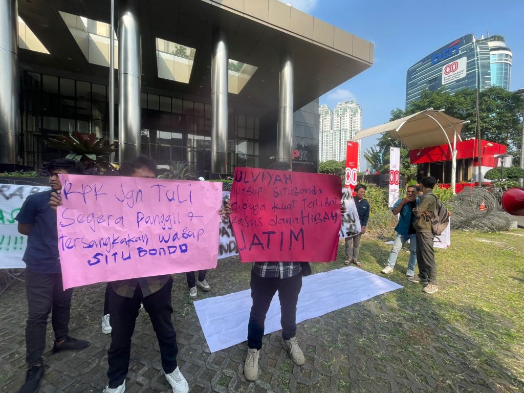 JAKARTA – Persatuan Mahasiswa Jatim Kawal Anti Korupsi (PMJKAK) kembali menggelar aksi demonstrasi Jilid II di depan Gedung Komisi Pemberantasan Korupsi (KPK), Jakarta, pada Jum’at (01/8). Aksi ini merupakan bentuk desakan kepada KPK untuk segera mentersangkakan Ulfiya (Wakil Bupati Situbondo), atas dugaan keterlibatannya dalam skandal korupsi dana hibah Pemprov JATIM.Dalam orasinya, KPK jangan tutup mata dan tuli dalam kasus-kasus korupsi yang menyeret pejabat daerah. Mereka menuntut agar tidak ada tebang pilih dalam proses penegakan hukum, terutama dalam kasus dugaan penyelewengan dana hibah yang merugikan keuangan negara hingga miliaran rupiah.“Kami mendesak KPK untuk tidak ragu mentersangkakan dan menangkap Ulfiya secara terbuka, transparan, dan profesional. Jika memang terbukti terlibat, maka harus segera diseret ke pengadilan,” tegas Ali (Koordinator), dalam keterangannya kepada media.Aksi ini juga membawa sejumlah poster bertuliskan tuntutan seperti “KPK Jangan Tuli, Segera Tangkap Wabup Situbondo Sekarang!”, “KPK Jangan Takut Kepada Maling Uang Rakyat!”, hingga “Tegakkan Supremasi Hukum di Situbondo!”.Menurut investigatisi dan informasi yang kami terima, Ulfiya diduga kuat memiliki keterkaitan dalam pengaturan alokasi dana hibah fiktif yang melibatkan sejumlah organisasi masyarakat dan yayasan di wilayah Jawa Timur. Serta ketersebutan nama Ulfiya dalam pengakuan beberapa saksi kunci yang kini telah ditahan semakin memperjelas Keterlibatan Wakil Bupati Situbondo. “Kami tidak ingin kasus ini tenggelam seperti kasus-kasus lainnya. Situbondo butuh wakil pemimpin yang bersih dan akuntabel,” tambah Ali.“Kami (PMJ) pastikan akan terus mengawal kasus ini, termasuk terus melakukan aksi demonstrasi di Kemendagri, dan KPK RI. Intinya Ulfiya (Wakil Bupati Situbondo) segera tersangkakan dan tangkap.”