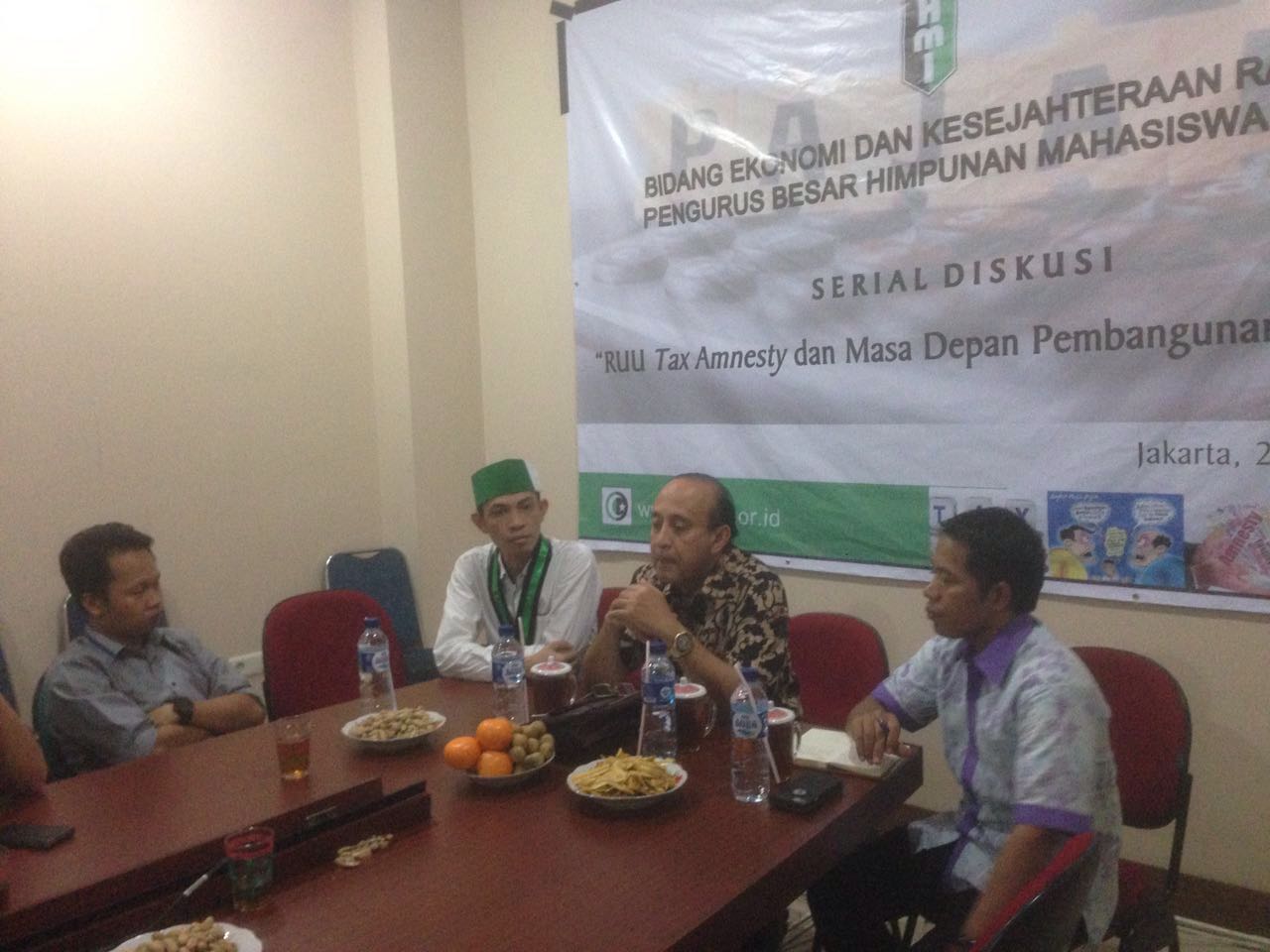 Pada kesempatan yang sama, PB HMI dalam Hal ini ketua Bidang Ekokesra menyatakan bahwa penerimaan kami pada RUU Tax Amnesty mensyaratkan adanya jaminan atau garansi bhwa jika RUU tersebut di sahkan, uang-uang yg dimaksudkan berada diluar negeri tersebut harus ditarik masuk ke dalam negeri terlebih dahulu.