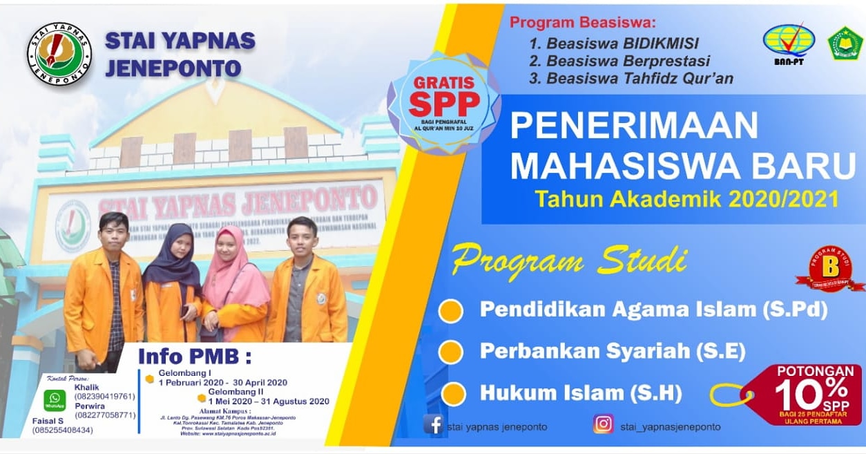 Visioner.id, Jeneponto – Kali ini STAI YAPNAS Jeneponto akan berbagi kabar gembira buat kalian yang ingin melanjutkan studi ke perguruan tinggi namun terkendala biaya. Sekolah Tinggi Agama Islam (STAI) YAPNAS Jeneponto  bisa menjadi pilihan kalian. Pada tahun akademik 2020/2021, kampus yang beralamat di Jalan Lanto Dg. Pasewang Km. 76 Mks.-Jp., Ci`nong Kelurahan Tonrokassi Kecamatan Tamalatea, Kab. Jeneponto ini kembali memberikan beasiswa kuliah kepada mahasiswa baru.