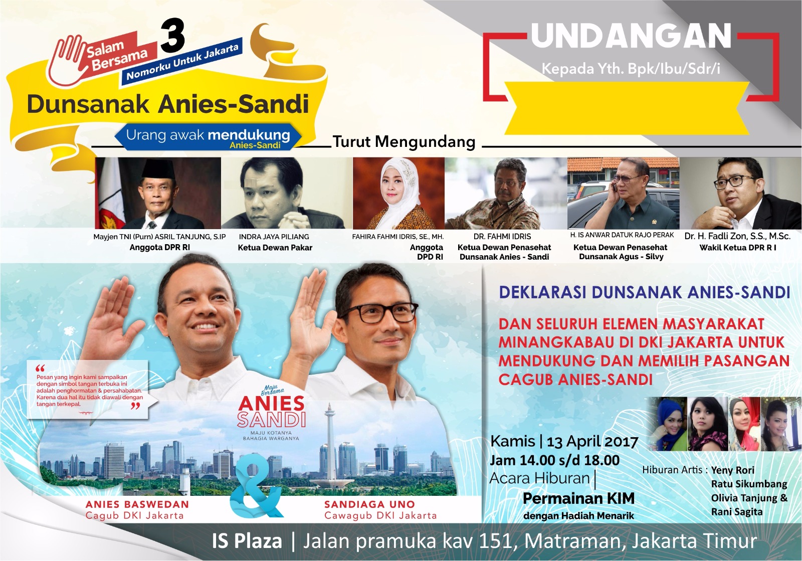 Sementara itu ketua pelaksana deklarasi Dunsanak Anies-Sandi,  Burmalis Ilyas. S.Ag, S.IP, MA, M.Si menjelaskan bahwa kami perantau minang di Jakarta komitmen untuk memenangkan Anies – Sandi.