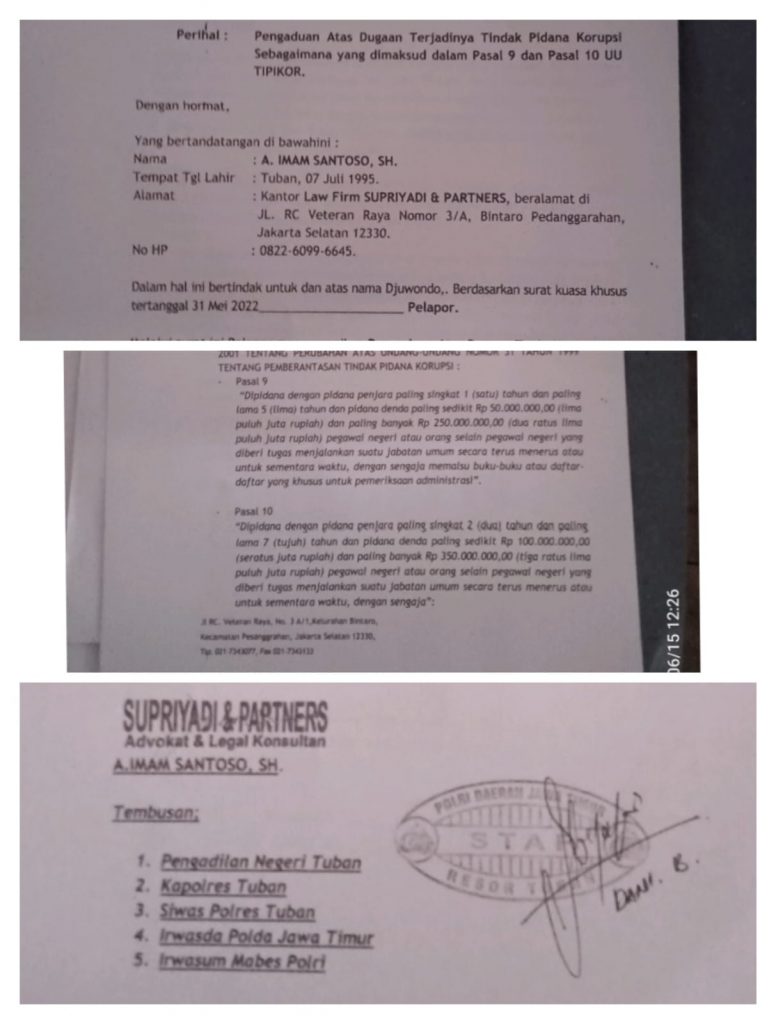 Tuban – Menurut keterangan Kuasa Hukum Djuwondo Lawfirm Supriyadi & Partner A Imam Santoso, SH. “Bahwa Kronologi peristiwa laporan polisi ini mulanya terjadi pada saat Kuasa Hukum Djuwondo meminta surat keterangan dan Indormasi sebanyak dua kali ke Kepala Desa Tahulu Merakurak Perihal Permohonan Informasi dan keterngan Tanah yang Terletak Di Dusun Bancang Desa Tahulu Kecamatan Merakurak Kabupaten Tuban dengan luas 6900 M2.