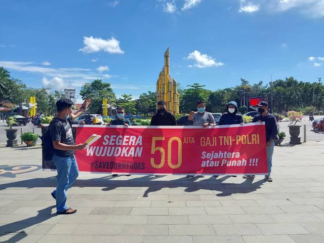 Aksi gerakan KITRA TNI-Polri membentang spanduk bertuliskan tuntutan menaikkan 50 juta gaji TNI-POLRI dengan tagline sejahterah atau punah di kawasan tugu Digulis depan kampus Universitas Tanjung Pura kota Pontianak.